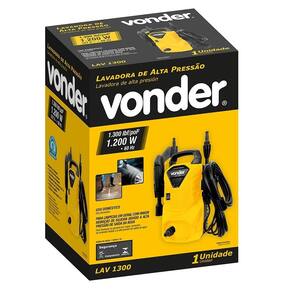 Produto: Lavadora de alta pressão 1.300 libras - LAV 1300 Marca: Vonder Voltagem: 110VDescrição: A Lavadora de alta pressão 1300 libras LAV 1300 da Vonder é indicada para limpezas em geral, com maior remoção de sujeira, devido a alta pressão de saída da água.Destaques ou diferenciais: conta com sistema que gera mais pressão e libera menos água, tornando-a mais eficiente e diminuindo desperdícios. Em media, uma torneira aberta consome 1.800 litros de agua por hora. com o uso da lavadora de alta pressão LAV 1300 esse consumo cai para 300 litros por hora, promovendo grande economia de água. Possui tamanho reduzido que facilita seu armazenamento, alça, suporte para armazenar a Ferramenta de aplicação e o cabo elétrico, promovendo maior organização. Bico da lança ajustável, com jato leque ou concentrado e acompanha ainda acessório para detergente. Conta também com sistema stop total que proporciona maior praticidade.Especificações: Cor: amarela e pretaPotencia: 1.200 wFrequência: 60 hzPotencia: 1,3 cv/hpNível de ruido: 75 db a Tipo de motor da lavadora de alta pressão: universalVazão máxima da lavadora de alta pressão: 390 litros/hora - 6,5 litros/minSegue norma: iec 60335-1 e iec 60335-2-79Pressão máxima de saída de água da lavadora de alta pressão: 1.300 lbf/polâ- 90 bar - 9 mpaDispositivo para aplicação de detergente da lavadora de alta pressão: reservatório externoLinha: levePressão nominal de saída de agua: 870 lbf/polâ - 60 bar - 6 mpaVazão nominal: 300 litros/hora - 5 litros/minMaterial dos pistões da bomba: aço inox.Itens Inclusos: Acessório para detergente, Mangueira de alta pressão com 3 m, Bico ajustável, Ferramenta de aplicação com gatilhoConector engate rápido de 1/ 2. Marca: Não Informado