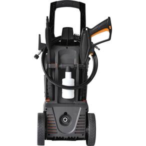 Acessórios: 1 Pistola de alta pressão com trava de segurança; 1 Bico regulável (leque e concentrado); 1 Bico turbo; 1 Mangueira de alta pressão de 5 metros; 1 Aplicador de detergente; 1 Engate rápido; 1 Agulha de limpeza do bico.