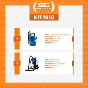 MUITO IMPORTANTE:-- CONFERIR PRODUTOS NO ATO DO RECEBIMENTO. NÃO ACEITAR PRODUTOS COM EMBALAGEM VIOLADA (AMASSADO, RASGADO, ABERTO, QUEBRADO, ETC), A RECUSA DEVE SER FEITA NO ATO.Lavadora De Alta Pressão Lava Jato ELP3000 E Aspirador De Pó E Água Eai20i 220V - EOSComponentes do kit:- 1 Lavadora De Alta Pressão Lava Jato Max Pro 1500Psi 1500W ELP3000 220V - EOS- 1 Aspirador De Água E Pó 20L Inox 1650W Max Pro EAI20I 220V - EOSLavadora De Alta Pressão Lava Jato Max Pro 1500Psi 1500W ELP3000 220V - EOS: Detalhes do produto:- APLICADOR DE SABÃO: Acompanha aplicador de sabão para facilitar a limpeza;- ECO SPRAY: 1500 PSI, economizando água gastando até 8x menos.Características:- Economiza água em relação a uma mangueira comum, gastando até 8x menos água.- 7 Mpa (70 Bar ou 1015 PSI) de pressão, para garantir uma limpeza profunda com pouco esforço.- Acompanha aplicador de sabão para facilitar a limpeza.- 1500W de potência, garantindo uma limpeza profunda.Ficha Técnica:- Voltagem: 220V;- Cabo de energia: 5m;- Potência (W): 1500W;- Consumo: 1,5 kWh;- Recipiente de sabão: 400 ml;- Máxima pressão de entrada: 0,4MPa (4bar);- Máxima temperatura da água: 50°C;- Pressão: 10,3 Mpa (103 Bar ou 1500 PSI) de pressão, para garantir uma limpeza profunda com pouco esforço;- Vazão: 330 L/H;- Nível de pressão sonora: 64 dBA;- Amperagem (A): 10 A;Acessórios Inclusos:– Mangueira de alta pressão;– Engate rápido para mangueira de jardim;Dimensões:- Comprimento cabo de força: 5m;- Comprimento mangueira de alta pressão: 3m;- Lavadora: 47,5 cm A x 26,5 cm L x 24,5 cm P;- Peso Líquido: 5kg;Aspirador De Água E Pó 20L Inox 1650W Max Pro EAI20I 220V - EOS:Características:- 3 em 1 – Aspira sólidos, líquidos e função soprador- Permite retirar folhas, encher balões e colchões infláveisFicha Técnica:- Voltagem: 220V/60Hz- Alimentação: elétrico- Modelo: EAI20I- Classificação: Aspirador- Capacidade do Reservatório (L): 20 L- Garantia: 12 meses- Potência (W): 1650 W- Consumo (kWh): 16,7kWh/mês- Amperagem (A): 10 A- Potência de sucção: 16,5 kPa (165 mBar)- Comprimento do fio de energia elétrica: 3 m- Diâmetro da mangueira: 3,5 cm ØAcessórios inclusos:- 1 mangueira de 1,5m- 3 tubos plásticos de 345mm- 1 bocal fino para limpeza de sofás e bancos- 1 saco coletor de tecido- 1 adaptador escova para chão- 1 filtro esponja 4 rodas.Dimensões:- Aspirador: 83 cm A x 45 cm L x 47 cm PMedidas da embalagem: 61cm A x 48cm L x 34cm P; Peso bruto: 11,5kg.
