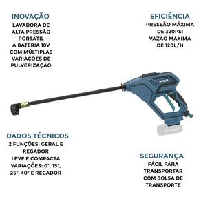 Dados técnicos Sem fio, leve e compacto, muito fácil de transportar; Utilização de água de qualquer fonte, não somente de torneiras; 2 funções: limpeza em geral e regador; Bocal de água portátil para limpeza fácil e rápida; Múltiplas variações de pulverização desde 0, 15, 25, 40 e função regador. Voltagem: 18v; Pressão máxima: 320psi; Taxa de fluxo de água máxima: 120l/h; Comprimento da mangueira: 6m; Pressão da água da entrada máxima: 73psi; Altura de sucção: 1,5m; Peso: 1,25kg; Entrada do carregador: bivolt.