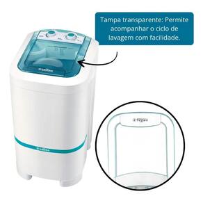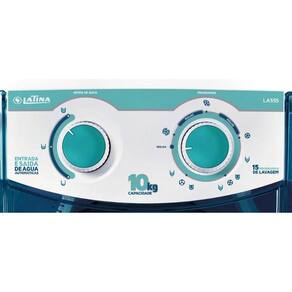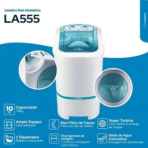 Lavadora Tanquinho Latina LA555 10kg Automática 220V com funcionamento totalmente automático, batedor de alta performance, visor transparente, dispenser prático e 15 programas de lavagem. Possui saída de água automática por bomba e design robusto.Acesso ao cesto