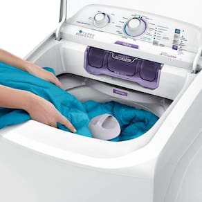 Os produtos diluídos são adicionados a Água pelas laterais do cesto e não depositados sobre as roupas, evitando manchas.