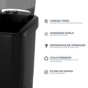 Desfrute de recursos inteligentes: o dispenser duplo libera sabão e amaciante no tempo exato, prevenindo manchas e garantindo uma distribuição uniforme dos produtos. Além disso, o sistema de eliminação de fiapos mantém suas roupas sempre impecáveis. Com centrifugação e cesto em plástico resistente, a Britânia BLT22P oferece qualidade, durabilidade e alta capacidade para o seu lar.