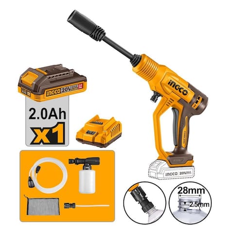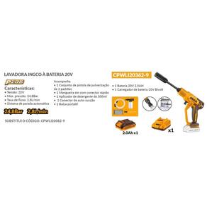 Lavadora de alta pressão ingco à bateria íon-lítio 20v Referencia: cpwli20362-9 Características: Tensão: 20v Pressão máxima: 24,8 bar 360 psi Taxa de fluxo: 2,8l / min Sistema de parada automática 1 bateria 2.0ah 1 carregador de baterias bivolt: 1h 2.0ah ou 2h 4.0ah bivolt 1 conjunto de Ferramenta de aplicação de pulverização de 6 padrões 1 mangueira de entrada de água de 6 m com conector rápido 1 conector de auto-sucção 1 aplicador de detergente e 300ml 1 bolsa portátil Embalado em caixa de papelão Marca: Não Informado Ean: 6942141813580