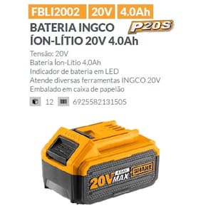 Quanto maior a amperagem da bateria intercambiável Ingco maior é o tempo de trabalho da Lavadora sem a necessidade de troca ou recarga da bateria. Temos kit com baterias de 2.0; 4.0; 5.0; 6.0 e 7.5 amperes.