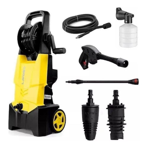 Lavadora de alta pressão, com ótima pressão aliada ao design. Força extra para sujeiras mais difíceis. Com jato d'água ajustável indicada para serviços domésticos como quintais, janelas, tapetes, veículos, motocicletas, telhados entre outras tarefas. Pressão máx.: 1755 (121) Libras (bar) Vazão máx.: 390 L/h Potência Absorvida: 1800 Watts Alimentação: Energia Elétrica Temp. Entrada max: 44 C Difusor Detergente: 0,2 Litros Lança com Regulagem: Sim Lança Turbo: Sim Mangueira Alta Pressão: 5 Mts