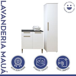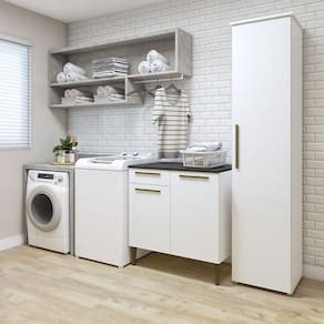 Lavanderia Mauá 1 Armário Multiuso E Balcão Kaiki Móveis Branco Lavanderia Modulada 1 Armario Multiuso e Balcao Maua Nosso conjunto de moveis para area de servico e perfeito para organizar sua area de servico com praticidade e elegancia. Oferece amplo espaco para armazenar produtos de limpeza, ferramentas e outros itens essenciais, garantindo um ambiente funcional e bem arrumado. O armario multiuso conta com prateleiras espacosas, enquanto o balcao oferece uma superficie util e compartimentos extras. Com design moderno e materiais resistentes, e a solucao ideal para ter organizacao e estilo no dia a dia!