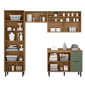 A Lavanderia Modulada Toscana é a decisão certa para transformar sua área de serviço com organização e praticidade. Composto por dois armários aéreos, um balcão com tampo e um armário multiuso, ele oferece espaço de sobra para armazenar produtos de limpeza, ferramentas e acessórios essenciais. O multiuso possui prateleiras amplas, enquanto os aéreos proporcionam uma superfície útil para apoio e deixar os produtos do dia a dia à mão. Além disso, um dos aéreos possui nichos para expor suas coleções ou plantinhas , o que proporciona elegância. Feito com materiais de qualidade, é resistente e funcional, adaptando-se perfeitamente a diversos ambientes. Com design moderno, garante estilo e eficiência no seu dia a dia! Acabamento da Gaveta: Pintura Texturizada UV Acabamento da Porta: Pintura Texturizada UV Acabamento da Prateleira: Pintura Texturizada UV Acompanha Manual de Instalação: Sim Altura dos Pés: 15 cm Altura Máxima dos Pés: 15.0000 Ambiente Principal: Área de Serviço codigo_ean: 7900288062130 Complexidade da Montagem: Média: pode ser montado por mais de uma pessoa e/ou necessite de maior conhecimento para montagem Cor: Freijó/Jade Cor do Produto: Freijó/Jade Cor Interna: Ártico Escala de Brilho: Semi-Brilho Escala de Brilho da Gaveta: Semi-Brilho Escala de Brilho da Porta: Brilhante/Fosco Escala de Brilho da Prateleira: Semi-Brilho Espessura da Chapa: 15 mm Fita Integrada: Não Gaveta com Chave: Não Itens Inclusos: 1 Aereo + 1 Aereo Basculante + 1 Balcão Pia + 1 Multiuso + 1 Tampo + Kit Ferragens + Manual de Montagem Linha ou Coleção: Toscana Manual de Montagem e Instalação: https://product-hub-prd.madeiramadeira.com.br/976328/documents/fd74e38d-05be-41f5-8a0e-c44de3f1290b2659859539817385906608237.pdf Marca: Espresso Móveis Material da Gaveta: MDF Material da Porta: MDF/Vidro Material da Prateleira: MDF Material do Puxador da Gaveta: Alumínio Material do Puxador da Porta: Alumínio Material dos Pés: ABS Material Principal: MDF modular: Sim Necessita Montagem: Sim O Módulo Pode ser utilizado individualmente: Sim Origem do Produto: Nacional Pés Reguláveis: Sim Pés Removíveis: Sim Peso: 161,7 kg Peso Máximo por Gaveta: 3 kg Peso Máximo por Prateleira: 6 kg Possui Cabideiros: Não Possui Espelho: Não Possui Pés: 09 Possui Suporte para Vassoura: Não Possui Tábua: Não Possui Tulha/Cesto: Não Possui Vidro: Sim Prateleiras Removíveis: Não Quantidade de Gavetas: 03 Gavetas Quantidade do Produto: 1 Recomendações de Uso, Manutenção e Limpeza: Para manter seu móvel novo por muito mais tempo, evite locais úmidos, mantenha-o distante de líquidos e de fontes de calor. Evite a exposição prolongada ao sol. Para limpá-lo com segurança utilize uma flanela seca sem produtos abrasivos e nem lustra móveis. Resistente à Chuva: Não Sapatas Niveladoras: Não Sistema de Montagem: Parafusos e Cavilhas Suporta Até (kg): 70 kg Tipo de Armário Multiuso: Armário Multiuso Tipo de Corrediça da Gaveta: Metálica Telescópica Tipo de Dobradiça/Corrediça da Porta: Aço Tipo de Gaveta: Interna e Externa Tipo de Porta: Misto (Bater e Basculante) Tipo de Puxador da Gaveta: Externo Tipo de Puxador da Porta: Externo