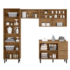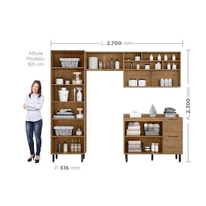 A Lavanderia Modulada Toscana é a decisão certa para transformar sua área de serviço com organização e praticidade. Composto por dois armários aéreos, um balcão com tampo e um armário multiuso, ele oferece espaço de sobra para armazenar produtos de limpeza, ferramentas e acessórios essenciais. O multiuso possui prateleiras amplas, enquanto os aéreos proporcionam uma superfície útil para apoio e deixar os produtos do dia a dia à mão. Além disso, um dos aéreos possui nichos para expor suas coleções ou plantinhas , o que proporciona elegância. Feito com materiais de qualidade, é resistente e funcional, adaptando-se perfeitamente a diversos ambientes. Com design moderno, garante estilo e eficiência no seu dia a dia! Acabamento da Gaveta: Pintura Texturizada UV Acabamento da Porta: Pintura Texturizada UV Acabamento da Prateleira: Pintura Texturizada UV Acompanha Manual de Instalação: Sim Altura dos Pés: 15 cm Altura Máxima dos Pés: 15.0000 Ambiente Principal: Área de Serviço codigo_ean: 7900288062123 Complexidade da Montagem: Média: pode ser montado por mais de uma pessoa e/ou necessite de maior conhecimento para montagem Cor: Freijó Cor do Produto: Freijó Cor Interna: Freijó Escala de Brilho: Semi-Brilho Escala de Brilho da Gaveta: Semi-Brilho Escala de Brilho da Porta: Brilhante/Fosco Escala de Brilho da Prateleira: Semi-Brilho Espessura da Chapa: 15 mm Fita Integrada: Não Gaveta com Chave: Não Itens Inclusos: 1 Aereo + 1 Aereo Basculante + 1 Balcão Pia + 1 Multiuso + 1 Tampo + Kit Ferragens + Manual de Montagem Linha ou Coleção: Toscana Manual de Montagem e Instalação: https://product-hub-prd.madeiramadeira.com.br/976326/documents/e32e785d-81d1-4cfe-801e-4dcab8cf65e52659859539817385906608237.pdf Marca: Espresso Móveis Material da Gaveta: MDF Material da Porta: MDF/Vidro Material da Prateleira: MDF Material do Puxador da Gaveta: Alumínio Material do Puxador da Porta: Alumínio Material dos Pés: ABS Material Principal: MDF modular: Sim Necessita Montagem: Sim O Módulo Pode ser utilizado individualmente: Sim Origem do Produto: Nacional Pés Reguláveis: Sim Pés Removíveis: Sim Peso: 161,7 kg Peso Máximo por Gaveta: 3 kg Peso Máximo por Prateleira: 6 kg Possui Cabideiros: Não Possui Espelho: Não Possui Pés: 09 Possui Suporte para Vassoura: Não Possui Tábua: Não Possui Tulha/Cesto: Não Possui Vidro: Sim Prateleiras Removíveis: Não Quantidade de Gavetas: 03 Gavetas Quantidade do Produto: 1 Recomendações de Uso, Manutenção e Limpeza: Para manter seu móvel novo por muito mais tempo, evite locais úmidos, mantenha-o distante de líquidos e de fontes de calor. Evite a exposição prolongada ao sol. Para limpá-lo com segurança utilize uma flanela seca sem produtos abrasivos e nem lustra móveis. Resistente à Chuva: Não Sapatas Niveladoras: Não Sistema de Montagem: Parafusos e Cavilhas Suporta Até (kg): 70 kg Tipo de Armário Multiuso: Armário Multiuso Tipo de Corrediça da Gaveta: Metálica Telescópica Tipo de Dobradiça/Corrediça da Porta: Aço Tipo de Gaveta: Interna e Externa Tipo de Porta: Misto (Bater e Basculante) Tipo de Puxador da Gaveta: Externo Tipo de Puxador da Porta: Externo