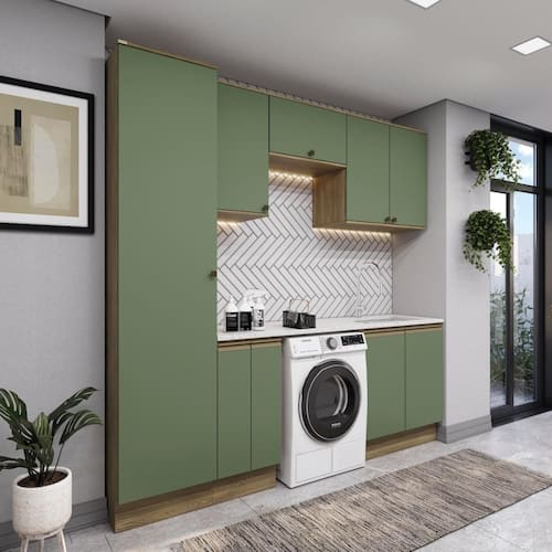 Organização e beleza em um mesmo espaço, aliado a qualidade do 100% MDF da Celeste da Kappesberg. Com funcionalidade e amplo espaço, a lavanderia será seu espaço favorito da casa com o combo CB1292. Com sete módulos e amplo espaço, o combo conta com o espaço ideal para organizar toalhas, cestos, produtos de limpeza e calçados, facilitando as tarefas do dia e mantendo sua casa sempre organizada. Os nichos menores, com corrediças telescópicas, são ideais para acessórios e produtos menores. Com até sete camadas de pintura, a caixaria é na cor nogueira, com acabamento touch, enquanto as frentes são em verde oliva, com acabamento fosco. Uma combinação moderna e aconchegante, remetendo aos tons da natureza, é perfeita para esse ambiente da casa, transformando-o com estilo e elegância, além de mais facilidade na limpeza. E para um acabamento perfeito, o combo possui rodapés, mas acompanha as ferragens para ser montado suspenso na parede. Outra opção, é adquirir os pés separadamente. E para um projeto ainda mais completo, as portas possuem amortecimento, proporcionando um fechamento suave, sem ruído e mais durabilidade. Os puxadores, metálicos e dourados, com modelos diferentes nos balcões e aéreos, completam a beleza e diferencial do produto.