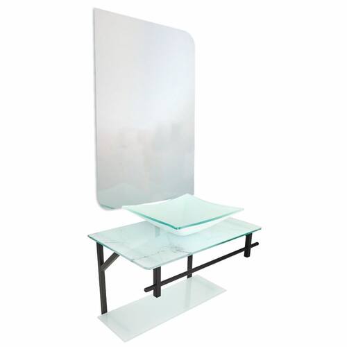 - Cor Branco Marmorizado. Cuba em vidro temperado 10mm. Tampo e prateleira em vidro lapidado 8mm. Espelho 4mm. Suportes em metal resistente