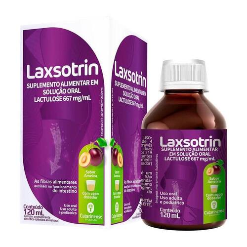 Laxsotrin suplemento alimentar sabor ameixa - 120ml Laxsotrin é fonte de fibras alimentares que auxiliam no funcionamento do intestino. Laxsotrin foi desenvolvido com o ingrediente lactulose, que é fonte de fibras e auxilia no funcionamento do intestino. É indicado para crianças e adultos e pode ser consumido sozinho ou com alimentos, podendo também ser misturado a suco de frutas, leite, bebidas vegetais, iogurte, água ou qualquer outro líquido. - indicado para gestantes e lactantes; - indicado para crianças 4+.