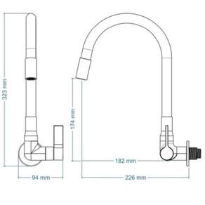 A torneira de parede Leão possui cano flexível em silicone de alta resistência e mecanismo 1/4 de volta M22.