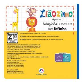 Título do livro : Leãozinho Autor : Susie Brooks Idioma : Português Editora do livro : Ciranda Cultural Edição do livro : 1 Capa do livro : Mole Ano de publicação : 2021 Quantidade de páginas : 10 Altura : 14 cm Largura : 14 cm Material da capa do livro : Cartonado Com páginas para colorir : Não Com realidade aumentada : Não Gênero do livro : Infantil Subgêneros do livro : Animais, Leão, Som, Diversão, Barulho Tamanho do livro : Médio Coleção do livro : Som Fofinho Idade mínima recomendada : 0 anos Quantidade de livros por kit : 1 Ilustradores : Jayne schofield Data de publicação : 18-03-2022 Peso : 500 g
