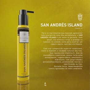 Leave in masculino san andrés island 120ml el capitán Leave-in san andrés island 120ml Perfeito para o homem. Cabelos macios, sem pesar e sem frizzz. Função - eliminar o frizz do cabelo ou da barba - nutrir os fios - manter a umidade natural dos fios - conferir brilho aos fios - proteger os fios - lubrificar os fios - condicionar os fios Benefícios - cabelos e barba macios e brilhantes - não deixa os fios pesados - termo protetor - mais força para os fios - ação anti-oxidante / anti-idade Princípios ativos: - vitamina e: possui ação antioxidante, nutre, hidrata e regenera. - óleo de macadâmia: emoliente, hidratante, antienvelhecimento, promove maciez e lubrifica os fios. - queratina: garante força e elasticidade a fibra capilar, protegendo e impermeabilizando os fios contra agressões do meio ambiente. Fragrância Intensidade forte essência cítrica e amadeirada. Modo de uso Com o cabelo e barba limpos e ainda úmidos, aplique uma pequena quantidade do produto de maneira homogênea nos fios; finalize como desejar. Dica: pode ser utilizado também como protetor térmico para escovação do cabelo e barba.
