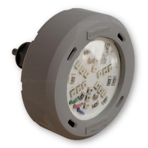 Sistema de cores RGB Driver não incluso Acabamento em ABS IP - 68 Potência 9.0W Alimentação 12CC Cabo de 1.50m Instalação padrão em tubo de 20mm de diâmetro Adaptável em tubos de 25 e 50mm de diâmetro Mínimo de espelho 10cm Lente em policarbonato transparente Para piscina de vinil/fibra necessita de adaptador Referência: 025930