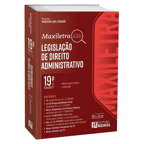 Destaques: CF: atualizada até a EC nº 135/2024; Lei de Responsabilidade Fiscal: atualizada até a LC nº 214/2025; Marco Regulatório da Primeira Infância: atualizado até a Lei nº 14.880/2024; Lei nº 14.965/2024: dispõe sobre normas gerais relativas a concursos públicos; Dec. nº 12.174/2024: dispõe sobre as garantias trabalhistas na execução dos contratos administrativos; Novas Súmulas Vinculantes do STF; Novas Súmulas do STJ. Edição atualizada até 20/01/2025 A Editora Rideel, atendendo à necessidade de estudantes e profissionais da área jurídica por obras com letras maiores, que permitam uma leitura agradável no texto legislativo plenamente atualizado, criou a Coleção de Legislação Maxiletra 2025. O projeto gráfico e a organização, feitos por especialistas em cada área, conjugam praticidade e comodidade, e os diversos facilitadores de consulta continuam sendo um diferencial das obras, apreciados pelos operadores, professores e acadêmicos do Direito há décadas. A obra contempla: Índice Cronológico Geral, contendo todos os diplomas legais publicados na obra; Notas remissivas a outros artigos, diplomas legais e súmulas; Índices Sistemático e Alfabético-Remissivo para cada Código; Índices por assuntos da legislação extravagante; Atualizações recentes em destaque; Tarjas laterais identificativas das seções; Indicação do número dos artigos no cabeçalho dos Códigos e do número das leis no cabeçalho da legislação.