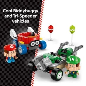 LEGO Super Mario: Mario Kart Baby Mario vs. Baby Luigi - Conjunto de montar de brinquedo colecionável para crianças, meninos e meninas, a partir de 8 anos - Brinquedo Nintendo Mario Kart para fãs - - Brinquedo Mario Kart Junte forças com o bebê Mario ou o bebê Luigi para batalhas de balões e ação de corrida com este conjunto de brinquedo de aventura LEGO Super Mario - 2 brinquedos colecionáveis de Mario Kart Este conjunto inclui bonecos de brinquedo Baby Mario e Baby Luigi, além de 6 balões montáveis 3 vermelhos, 3 verdes - Inclui dois brinquedos MARIO KART Coloque o brinquedo Baby Mario em seu brinquedo Biddybuggy e Baby Luigi em seu Tri-Speeder e lance conchas para tentar derrubar os balões - Jogo interativo dirija o Biddybuggy ou Tri-Speeder com LEGO Mario, LEGO Luigi ou LEGO Peach bonecos não incluídos para acionar efeitos sonoros/visuais do Mario Kart para buzinar, flutuar e muito mais - Presente de aniversário para crianças Dê este conjunto LEGO Super Mario para meninos, meninas e jogadores a partir de 8 anos; colete conjuntos de bonecos LEGO Mario 71439 , LEGO Luigi 71440 ou LEGO Peach 71441 - Dimensões Este carrinho de brinquedo mede mais de 5 cm. 5 cm de altura, 7,6 cm. 7 cm de largura e 10 cm. 10 cm de comprimento