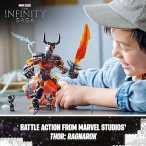 Este brinquedo de Super-herói LEGO Marvel Figura de Construção Thor vs. Surtur 76289 é baseado em uma cena do sucesso da Marvel Studios Thor: Ragnarok. Com personagens icônicos, recursos eletrizantes e infinitas oportunidades para aventuras de Super-herói imaginativas, esse conjunto LEGO Marvel é um ótimo presente para crianças maiores de 8 anos. O conjunto inclui 3 minifiguras: o Thor e 2 guerreiros demônios de fogo. Assim como no filme, o Thor se liberta das correntes que o prendem e batalha contra Surtur. A figura articulada para construir de Surtur pode ser posicionada em diferentes poses de ação. Ele empunha uma grande espada de fogo e usa uma coroa com chifres. Um conector transparente permite que as crianças conectem a minifigura do Thor ao Surtur construível para dar a aparência de que o Vingador está voando. Para mais diversão digital, os construtores podem ampliar, girar modelos em 3D e acompanhar seu progresso usando o aplicativo LEGO Builder intuitivo.