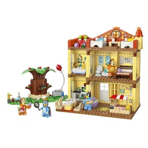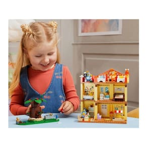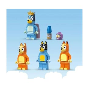 A casa de jogos modular com vários cômodos vem com 4 minifiguras Bluey, Bingo, Chilli e Bandit além de acessórios, incluindo uma capa de arco-íris, varinha e lupas. Todos os cômodos são destacáveis, permitindo muitas maneiras de brincar. Dentro da sala de jogos há uma casa de bonecas, piano e barraca de comida de faz de conta. A cozinha tem geladeira, forno, fogão, mesa e cadeiras. No andar de cima fica o quarto da mamãe e do papai e um banheiro. O quarto do sótão de Bluey e Bingo tem um tapete, luminária e a figura Chattermax. Ao lado fica o trono da rainha, completo com bule, xícara e sapo. No jardim há uma árvore grande, um cachorro-quente, pizza, torneira de água, Jeremy, o gnomo, e um balão para jogar no ar.
