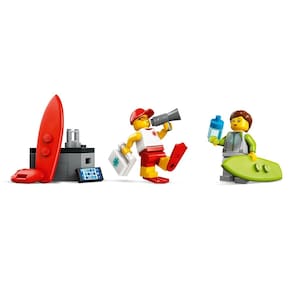 Além de incluir também 3 minifiguras, 1 de salva-vidas, 1 de surfista e uma figura de tubarão para brincadeiras cheias de imaginação.