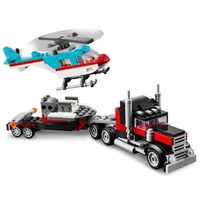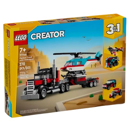 Aventuras em ritmo acelerado aguardam meninos e meninas a partir de 7 anos com o conjunto LEGO Creator Caminhão Flatbed com Helicóptero (31146). Eles podem usar as 270 peças do conjunto 3 em 1 para construir um incrível caminhão transportador com rodas móveis que pode transportar um helicóptero LEGO com pás de rotor móveis em seu trailer.