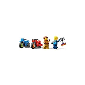 O que vem na caixa - Inclui dois anéis de acrobacias, 2 rampas de salto, 2 motos com roda de inércia e 2 minifiguras de motoqueiros
