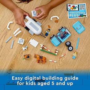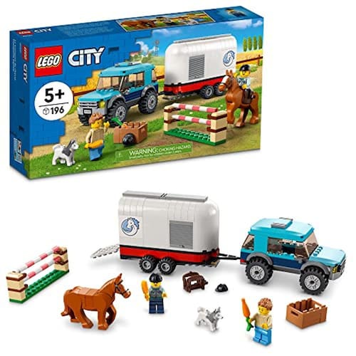 Aqui está um ótimo playset para crianças de 5 anos ou mais que amam cavalos. O conjunto de construção LEGO City Horse Transporter (60327) vem com tudo o que as crianças precisam para horas de aventuras imaginativas de equitação, incluindo um SUV de brinquedo com um reboque de cavalo destacável, um salto ajustável de altura, 2 minifiguras, uma figura de cavalo e uma figura de cachorro. Este conjunto inclui um guia de construção pictórico passo a passo e instruções interativas de construção digital. Disponível no aplicativo LEGO Building Instructions para smartphones e tablets, o guia digital intuitivo com ferramentas de zoom e rotação permite que as crianças visualizem o modelo acabado à medida que constr. Os playsets lego City Great Vehicles colocam as crianças no centro da ação com modelos realistas e personagens inspiradores que inspiram jogos imaginativos abertos.