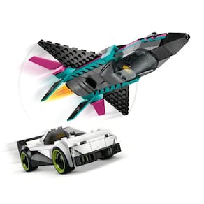Este conjunto de brinquedos LEGO City Jato vs Carro (60489) com dois veículos inclui um supercarro elegante e um jato supersônico para muita diversão imaginativa em corridas. O jato de brinquedo possui asas em flecha, duas aletas verticais e estabilizadores. As crianças podem deslizar uma alavanca para acionar os pós-combustores do jato e abrir a cabine do supercarro para acessar o interior detalhado, completo com um assento de corrida. Basta adicionar as minifiguras do piloto e do piloto de corrida para horas de ação épica em corridas. Torne qualquer dia especial com este kit de construção de jato e carro.