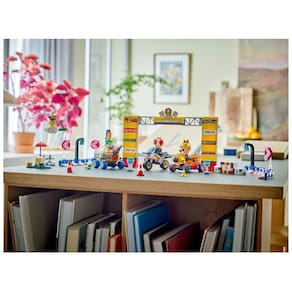 LEGO Conjunto Bebê Peach e Grande Prémio Preparar, apontar, construir As crianças criam sua própria pista e veículos de Mario Kart, pilotam rumo à vitória e vivem aventuras com personagens icônicos neste LEGO Super Mario: Mario Kart Conjunto Bebê Peach e Grande Prémio 72036 com 823 peças. Uma incrível ideia de presente de personagens da Nintendo para crianças e jogadores maiores de 8 anos, este kit de brinquedo de corrida personalizável inclui os veículos Wild Wiggler, Autonave e Standard Bike que disparam cascos, um portão de partida, barreiras de pista, cones de trânsito, um pódio de vencedores, o carrinho de doces do Toad e a nuvem de Lakitu. O conjunto contém as figuras da Bebê Peach, Lakitu, Lemmy e o Toad.
