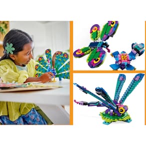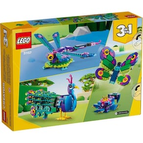 - Pemite a montagem de 3 modelos diferentes: o pássaro pavão, libélula e borboleta. Os dois últimos possuem expositores. - São 355 peças, recomendado para fãs de Lego a partir de 7 anos de idade; - O pavão mede 20 cm de altura