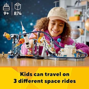 Fãs do espaço maiores de 9 anos vão desfrutar de um passeio emocionante a um parque de diversões com este conjunto LEGO® Creator Montanha-Russa Espacial (31142) cheio de detalhes. Ele inclui um trilho de montanha-russa serpenteante com 3 carrinhos móveis para voltas divertidas, que passam voando pelo foguete espacial decorativo, modelos de Saturno e da Terra, uma base lunar e uma estrela cadente. Há também um meteoro legal com uma peça de luz que ilumina, além de 5 minifiguras.