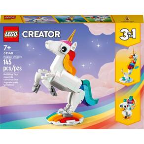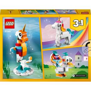 Brinquedos lúdicos para crianças de 7 anos combinam diversão e aprendizagem. Com LEGO Creator 3 em 1 – Unicórnio Mágico (31140), meninos e meninas vão se encantar com animais lendários em jornada criativa por belos contos de fada. Os conjuntos de construção LEGO Creator 3 em 1 são brinquedos educativos e divertidos, com 3 experiências em apenas 1 caixa. Este modelo traz 145 peças que vão despertar a curiosidade dos pequenos construtores que amam animais mitológicos. O desafio começa por construir um unicórnio mágico, que fica em pé nas quatro patas ou empinado em duas patas, depois reconstruí-lo como cavalo marinho e transformá-lo em bicho pavão com cauda colorida. O brinquedo de montar oferece infinitas possibilidades de criação personalizada, levando a imaginação infantil às alturas. Todas as três figuras de animais são articuláveis para deixar o jogo de fantasia ainda mais realista. Aviso legal• Recomendado a partir dos 7 anos.