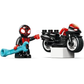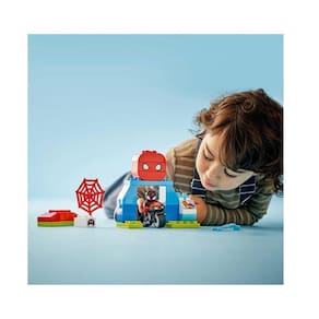 Crianças em idaar com mais de 2 anos que adoram jogos de ação recriam cenas do programa de TV Disney+ Spidey e seus incríveis amigos com o brinquedo Spin's Motorcycle Adventure. Inclui uma figura LEGO DUPLO Spin, uma moto de brinquedo dirigível, um QG e rampa de brinquedo para construir e reconstruir, um elemento de teia e uma peça de aranha-robô Trace-E. As crianças brincam de ser Spin, realizando acrobacias na motocicleta de brinquedo, pegando tijolos no elemento web ou formando parceria com o robô-aranha Trace-E.