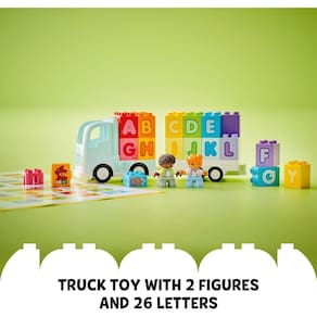 Impulsione a aprendizagem das letras das crianças com o brinquedo de construção LEGO® DUPLO® Town Alphabet Truck (10421) para crianças em idade pré-escolar. Este brinquedo ABC criativo oferece muito aprendizado lúdico. À medida que as crianças conectam o trailer ao caminhão de brinquedo e ajudam as 2 figuras LEGO DUPLO a carregar e descarregar os tijolos, elas começam a reconhecer letras, aprender cores, melhorar sua linguagem e aprimorar suas habilidades motoras finas. Os acessórios imaginativos incluem um elemento de brinquedo do livro LEGO DUPLO ABC e um elemento estéreo para incentivar divertidas canções ABC com pais e crianças pequenas. Este brinquedo educativo incentiva as crianças a inventar histórias criativas enquanto sobem na cabine do caminhão de brinquedo e partem para uma nova aventura! Faça com que as crianças comecem bem com os brinquedos de construção LEGO DUPLO, que colocam brincadeiras abertas, autoexpressão e aprendizagem nas mãos das crianças. Brinquedo de construção que ensina letras a crianças pequenas – Suba a bordo do brinquedo LEGO® DUPLO® Town Alphabet Truck para brincadeiras repletas de aprendizado divertido do ABC para maiores de 2 anos Brinquedos de construção para crianças em idade pré-escolar