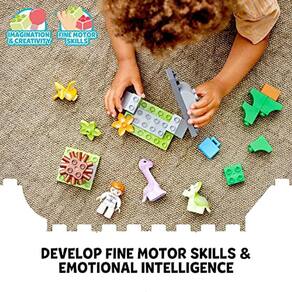 Aventuras abertas de cuidados com animais com LEGO DUPLO Jurassic World Dinosaur Nursery (10938) para fãs de dinossauros pré-escolares com mais de 2 anos. Conjunto de brinquedos de dinossauro bebê fofo Crianças que amam animais podem se juntar a Claire Dearing do Jurassic World para cuidar de 3 bebês dinossauros. Há um tricerátopo em uma caverna, um Pteranodonte em um ninho e um braquiossauro usando seu pescoço longo para mordiscar as folhas de uma árvore. Enquanto seu pequeno aluno brinca com os adoráveis dinossauros em seus habitats florestais, eles também desenvolverão suas habilidades motoras finas e inteligência emocional. Aprendizagem lúdica para crianças Os pais podem compartilhar marcos preciosos de desenvolvimento, pois os brinquedos LEGO DUPLO colocam diversão aberta, autoexpressão e confiança nas mãos das crianças pequenas.