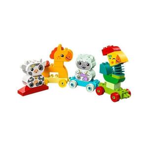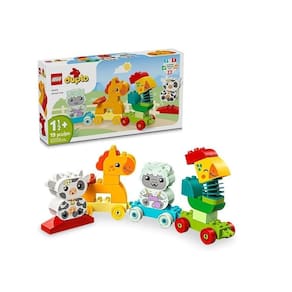 O Meu Primeiro Trem de Animais, este brinquedo educativo para crianças pré-escolares conta com 4 brinquedos de animais fofinhos construíveis: um galo, cavalo, cordeiro e vaca. Eles transportam os pequenos em uma aventura divertida. Os pequenos podem aprender habilidades de resolução de problemas enquanto seguem as cartas para construir os animais e combiná-los com as carruagens coloridas do trem de brinquedo. O veículo também inclui 2 peças adicionais para que as crianças possam expressar sua criatividade, construindo e reconstruindo os animais em suas próprias figuras. Recursos divertidos, como o pescoço flexível do galo e as carruagens conectáveis do trem ajudam a aprimorar as habilidades motoras dos bebês. Os brinquedos de animais Lego Duplo para bebês colocam a diversão livre, autoexpressão e exploração alegre nas mãos de crianças pequenas enquanto os pais compartilham marcos de desenvolvimento preciosos dos seus filhos.