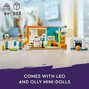 Se eles amam cozinhar, brincar criativamente ou ambos, as crianças de 6+ anos têm muito para descobrir neste jogo de mini-bonecas LEGO Friends Leo's Room (41754). Os fãs podem fazer uma demonstração de panificação com 2 dos personagens da série 2023 de LEGO Friends. Este brinquedo LEGO Friends apresenta mini-bonecas Leo e Olly. Leo fez um estúdio em seu quarto para filmar conteúdo para seu canal de panificação. As crianças vão adorar se juntar a ele e seu amigo Olly em suas atividades criativas. Olly é um especialista em criação de vídeos, então é o amigo perfeito para ajudar Leo. Há muitos recursos e acessórios de mini bonecas para inspirar a dramaturgia, incluindo um gato de estimação de brinquedo LEGO Friends, livro de receitas e câmera. Quando as filmagens terminarem para o dia, as crianças podem abrir as portas da varanda para que os amigos possam desfrutar de vistas para o mar a partir do quarto com tema de praia. Para uma aventura de construção fácil e intuitiva, apresente aos seus filhos a aplicação LEGO Builder. Aqui eles podem ampliar e girar modelos em 3D, salvar conjuntos e acompanhar seu progresso. As crianças podem fazer amigos com uma variedade de personagens diversos, descobrir locais emocionantes e representar aventuras da vida real no universo LEGO Friends com a próxima geração da cidade do coração. Este playset de mini-boneca é um brinquedo colecionável fantástico para crianças criativas com idades 6+ anos de idade e faz um ótimo presente de aniversário ou qualquer mimo. Este conjunto LEGO Friends mede mais de 2,5 pol. (7 cm) de altura, 5,5 pol. (14 cm) de largura e 3,5 pol. (10 cm) de profundidade. Contém 203 peças.