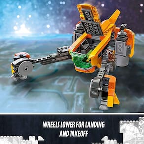 Este brinquedo construível recria a nave espacial que o Bebê Rocket usa para escapar de seus criadores no filme. A nave contém um cockpit que abre, trem de pouso ajustável e 2 disparadores de espigas. Além da figura do Bebê Rocket, o conjunto também inclui uma minifigura do Rocket adulto para inspirar mais emoção de Guardiões da Galáxia. Para ainda mais diversão digital, as crianças podem baixar o aplicativo LEGO Builder e adentrar um mundo criativo onde podem ampliar e girar modelos em 3D, salvar o conjunto e acompanhar seu progresso de construção.
