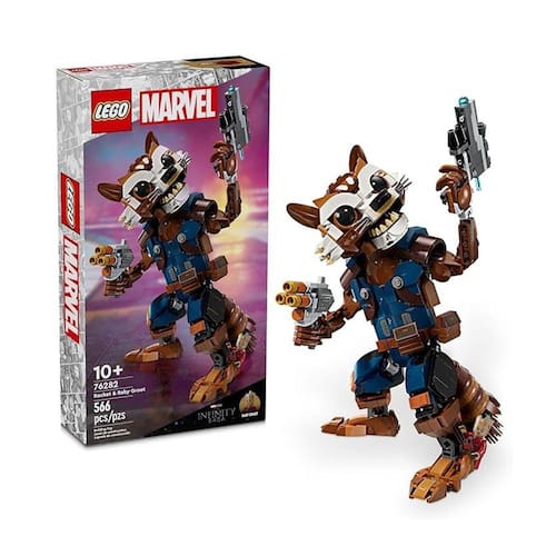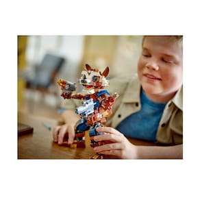 Leve a ação dos filmes da Marvel para o próximo nível com o Marvel Rocket e Bebê Groot. Este brinquedo construível para meninos e meninas maiores de 10 anos é articulado, autenticamente detalhado e mede mais de 22 cm de altura. Mais do que um brinquedo de construção para crianças, esta figura de ação do Rocket é uma recriação realista do icônico personagem de Guardiões da Galáxia da Marvel Studios. O modelo construível e posicionável captura a atitude desse herói. Todas as articulações (exceto os cotovelos) são móveis para o máximo de possibilidades para brincar e expor. O personagem segura um blaster em suas mãos. Em seu ombro está sentado seu adorável companheiro, o Groot Bebê. Se você busca brinquedos inovadores para jovens Super-heróis, o conjunto Rocket e Bebê Groot Marvel é a escolha perfeita para crianças que desejam exibir seu estilo de Super-herói. Para ainda mais diversão digital, os construtores podem ampliar e girar modelos em 3D e acompanhar o progresso deles usando o divertido e intuitivo aplicativo LEGO Builder.