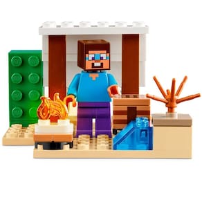 O conjunto inclui elementos icônicos do Minecraft, como uma mesa de artesanato, uma fogueira e várias peças de cenário desértico.