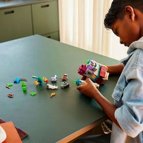 Ambientado no novo mundo de Minecraft Legends, esse brinquedo de herói LEGO Minecraft mostra um dos grandes chefões do jogo, o Devorador. Essa grande figura construível tem grandes braços que balançam e um corpo coberto em cascas, cicatrizes, feridas e fungo. Ao apertar um botão, o Devorador pode vomitar mísseis de sua boca e lançar elementos de muco de sua mochila. O kit de construção contém uma figura do Herói Guarda-Florestal do Minecraft, com elementos autênticos do jogo: uma bandeira, uma capa, uma espada de diamante e um alaúde. O Guarda-Florestal monta em um Grande Bico e comanda seus aliados, um esqueleto e um golem de pedregulho. Para ainda mais diversão com esse brinquedo de ação construível, o aplicativo LEGO Builder permite aos construtores ampliar e girar modelos em 3D e acompanhar o progresso deles.