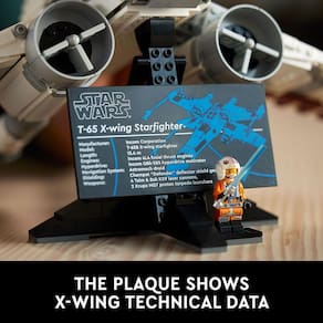 O X-Wing mede mais de 55 cm de comprimento e inclui um expositor construível que inclui uma placa mostrando os dados técnicos do X-Wing e espaço para a minifigura LEGO inédita lançada em maio de 2023 do Luke Skywalker com seu sabre de luz.