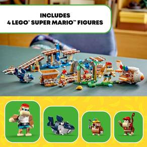 4 figuras LEGO® Super Mario™ do mundo de Donkey Kong™ – Funky Kong e Diddy Kong, além de um Tubarôncio para tirar do caminho e uma Toupeira Mineira para derrotar