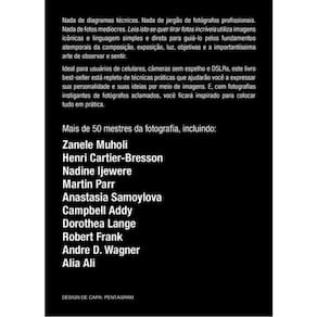 Nada de diagramas técnicos. Nada de jargão de fotógrafos profissionais. Nada de fotos medíocres. Leia isto se quer tirar fotos incríveis utiliza imagens icônicas e linguagem simples e direta para guiá-lo pelos fundamentos atemporais da composição, exposição, luz, objetivas e a importantíssima arte de observar e sentir. Ideal para usuários de celulares, câmeras sem espelho e DSLRs, este livro best-seller está repleto de técnicas práticas que ajudarão você a expressar sua personalidade e suas ideias por meio de imagens. E, com fotografias instigantes de fotógrafos aclamados, você ficará inspirado para colocar tudo em prática. Mais de 50 mestres da fotografia, incluindo: Zanele Muholi Henri Cartier-Bresson Nadine Ijewere Martin Parr Anastasia Samoylova Campbell Addy Dorothea Lange Robert Frank Andre D. Wagner Alia Ali Ean: 9786588280980