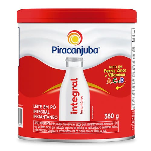 Leite em Pó Piracanjuba Integral Rico em Ferro, Zinco e Vitaminas A, C e D. Ingredientes : Leite integral e mix de minerais ferro, zinco e vitaminas A, C e D Alérgico: Contém Glúten* : Não Contém Aro