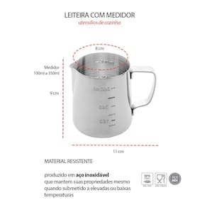 Leiteira em aço inox. Os Bules, chaleiras e leiteiras sao perfeitos para aquecer leite, derreter chocolate ou servir molhos de forma elegante. A leiteira foi produzida em aço inoxidavel de alta qualidade com acabamento elegante. A chaleira possui medidor de 100 a 350ml.