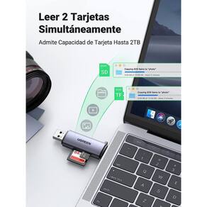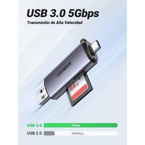 Mais detalhes do leitor de cartão ugreen usb c + usb a Leitor de cartão 2 em 1, ideal para celular e pc este leitor de cartão usb tipo c é para transferir arquivos entre um dispositivo usb tipo c. Possui duas conexões um conector tipo c compatível com celulares, tablets e computadores com porta tipo c um conector usb 3.0 plug and play para computadores. É ideal para transferir vídeos ou fotos hd para o seu telefone ou computador diretamente do cartão de memória. Slots duplos, leia 2 cartões simultaneamente: com slots de cartão sd/micro sd duplos, este leitor de cartão usb c permite que você leia e transfira dados de 2 cartões simultaneamente. Mais útil para economizar seu tempo. Suporta cartões de câmera nikon e canon como sd, micro sd, tf, sdxc, sdhc, mmc, rs-mmc, micro sdxc, micro sdhc. Nota antes de comprar este adaptador, certifique-se de que seu celular ou tablet usb c suporta a função otg. Alta velocidade de 5 gbps este leitor de cartão sd usb 3.0 suporta velocidades de transferência de dados de até 5 gb/s, o que permite transferir um filme hd de 1 gb em menos de 5 segundos, quase 10 vezes mais rápido do que o leitor de cartão sd. Cartões usb 2.0. Plug play, suporta cartão de memória máximo de 512g de cartões sd/tf. Robusto e anti-perda comparado com outros leitores de cartões de plástico, este leitor de cartões possui uma carcaça de alumínio de boa qualidade, oferece um acabamento elegante, é mais robusto e garante um uso duradouro. Tamanho pequeno e design anti-perda maximizam a conveniência, fácil de guardar em seu chaveiro, bolsa, carteira e levar para qualquer lugar. Liga de alumínio O leitor de cartão sd ugreen possui liga de alumínio durável e resistente ao desgaste, que parece elegante e elegante. As duas tampas protegem os plugues usb a e usb c contra poeira, solavancos ou choques, fáceis de guardar em seu chaveiro ou mochila. Chip avançado Ugreen usb c + usb um leitor de cartão sd adota chip usb 3.0, suporta leitura e gravação de cartão sd/tf simultaneamente e velocidade de transmissão eficiente de 5 gbps, o que melhora a eficiência da transferência de arquivos e imagens. Mecanismo de ejeção Os slots de cartão neste leitor de cartão têm funções de bloqueio e ejeção, os cartões sd e tf podem ser fixados mesmo se você mover o dispositivo. Pressione para ejetar o cartão com segurança. Taxa de transferência de dados 5 gigabits por segundo MarcaUgreen Dimensões do produto7,37 x 2,15 x 1,16 cm 0,28 gramas