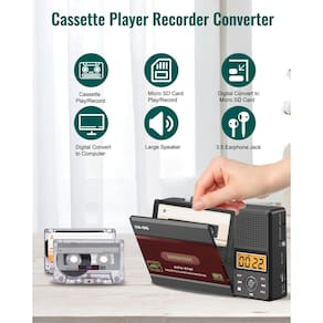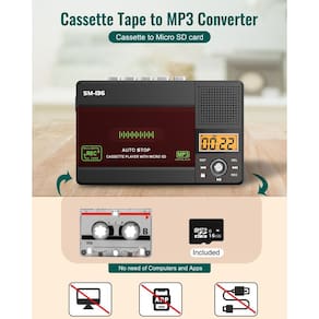 -?Conversor bidirecional de cassete para digital?O toca-fitas suporta duas maneiras de converter música em cassete em MP3. Converta facilmente fitas cassete de áudio em arquivos digitais MP3 em um cartão SD (incluído) ou converta rapidamente cassetes antigas para o formato MP3 por meio de um cabo USB usando o software Audacity (incluído). Preserve sua preciosa coleção de músicas em um formato digital moderno.