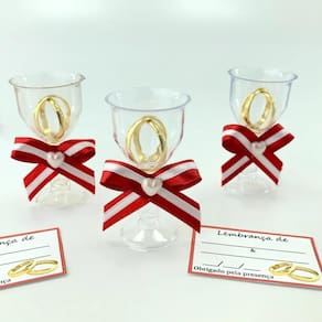 Tacinhas com aliancinhas kit com 30 unidades Lembrancinhas para casamento Lindas lembrancinhas para casamento, noivado ou bôdas. As tacinhas são decoradas com lacinho de cetim e um par de aliancinhas no interior da tacinha. São um mimo, charmosas e encantadoras, darão um toque todo especial expressando o sentimento de alegria e gratidão com seus amigos e familiares, que estiveram presentes no dia mais importante da sua vida. - Tacinhas em acrílico transparente; - Mede aproximadamente 6,5 cm de altura X 3,5 cm de diâmetro; - Decorada com lacinho de cetim, nas cores vermelho com branco; - Aliancinhas douradas no interior da tacinha dão um toque todo especial à sua lembrancinha; Os tags cartõezinhos acompanham o kit para você preencher com os nomes e data. TAGS NÃO PERSONALIZADOS do vendedor: 7 dias Marca: Não Informado
